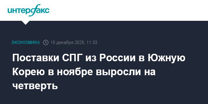 Южная Корея на 1/4 нарастила закупки российского сжиженного природного газа в ноябре 2025 года.