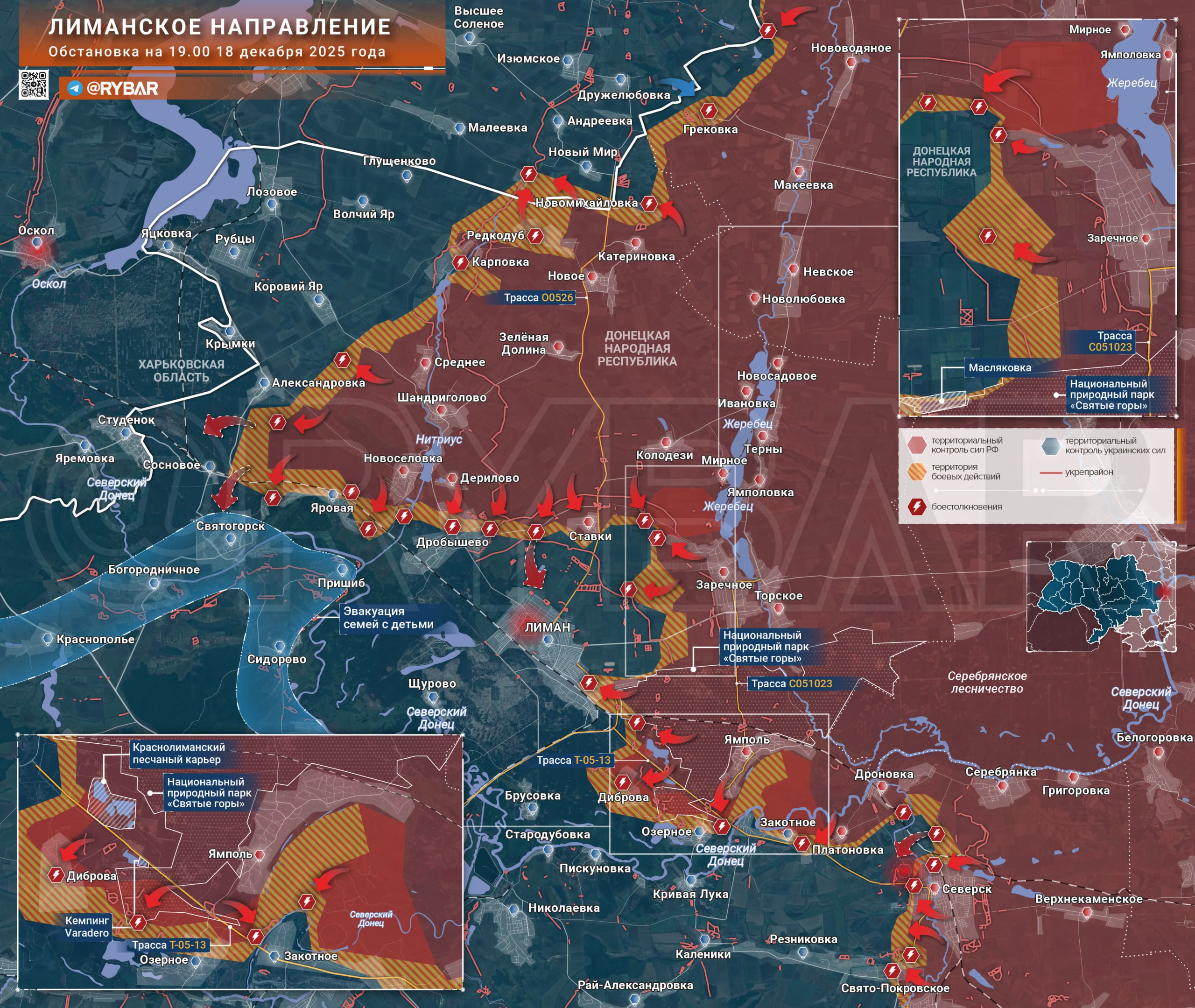 На Лиманском направлении российские войска продолжают бои в окрестностях одноименного города и у реки Северский Донец. Части ГВ «Запад» стремятся взять город в «клещи», атакуя позиции ВСУ в Дробышево и прорываясь на юго-запад через парк «Святые горы».